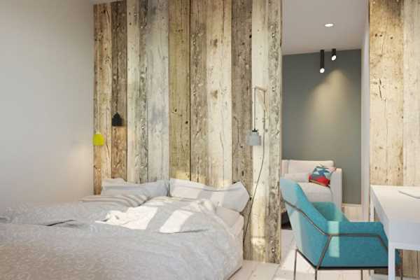 В зоне спальни расположилось рабочее место, которое отделено от гостиной деревянной перегородкой с интересной текстурой.
