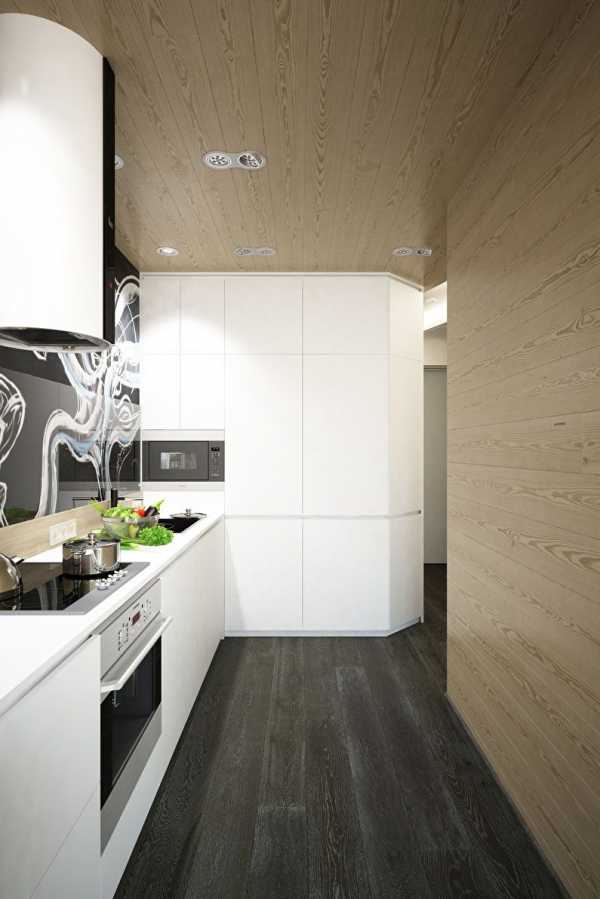 Санузел необходимо совместить. В кухонной зоне установите гарнитур со встроенной техникой. Холодильник поместите за шкафом пеналом.