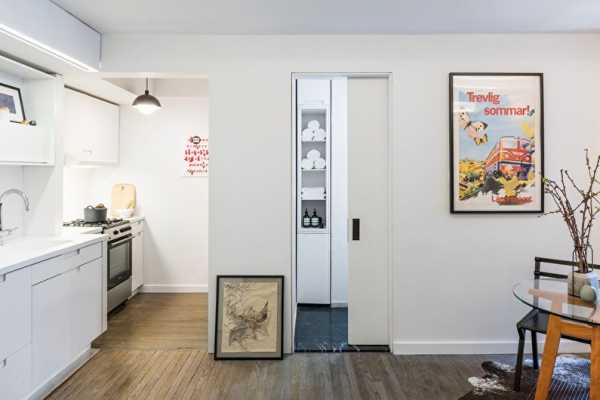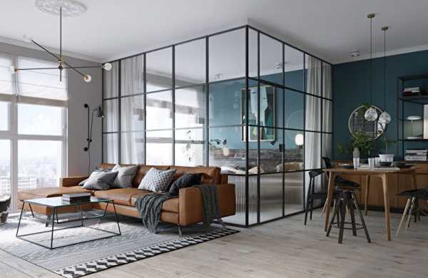- Применение невысоких сплошных перегородок, а также раздвижных панелей из каленого стекла. Раздвижные перегородки более функциональны. Они позволяют сохранить целостность пространства или изолировать часть квартиры в нужный момент. Например, чтобы помешать распространению запахов и чада из кухонной зоны или скрыть в ней беспорядок вкупе с грязной посудой.