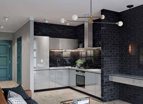 Зонирование обеспечивается за счет разных цветов и материалов. Так, зона кухни выделена с помощью черной кирпичной кладки стен, а также светлой глянцевой мебели, которые выступают в контрасте с белыми, зелеными и коричневыми цветами остальной части интерьера. Эти разнообразные дизайнерские решения «примиряет» светлый деревянный пол и белый потолок.