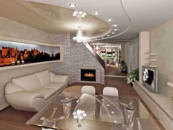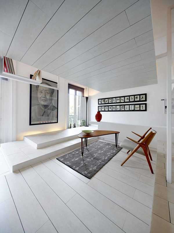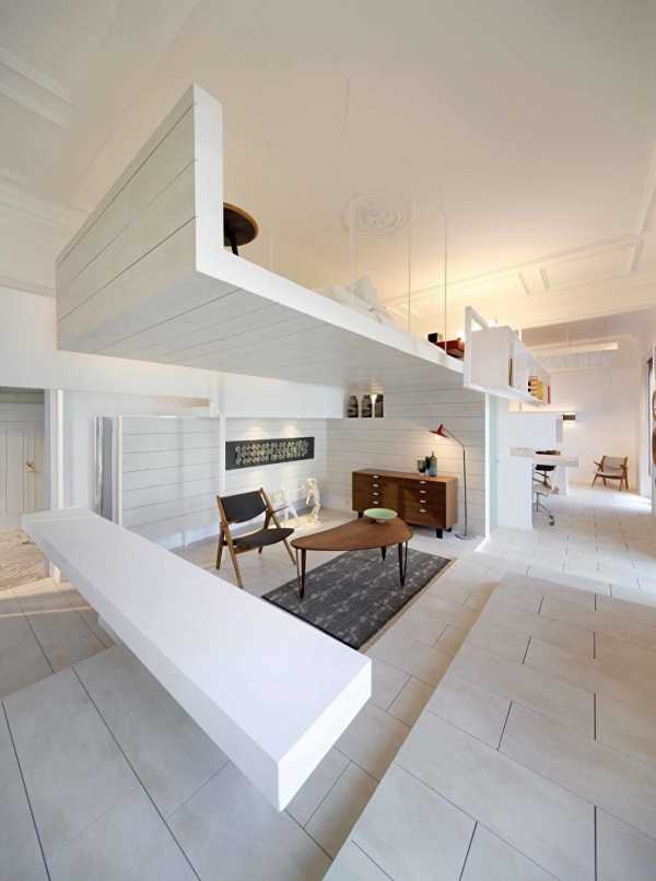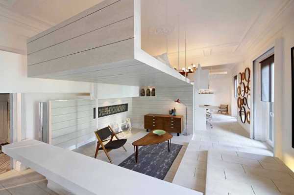 - Оформление разноуровневого помещения с помощью ступеньки-подиума. Разместите на нем зону приготовления пищи, мини-кабинет или гостевую зону с мягким диваном и креслами. Внутри подиума может скрываться кровать.