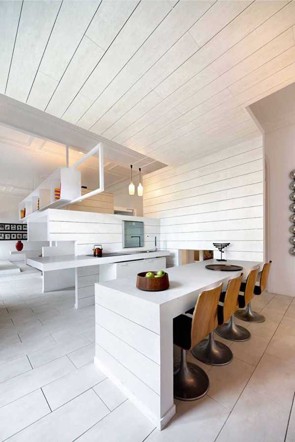 Обеденная зона включает в себя места для четырех человек, а выдвижные ящики и «стерильная» белизна кухни визуально увеличивают пространство. Отличный вариант для тех, кто не любит постоянство, даже у себя дома.
