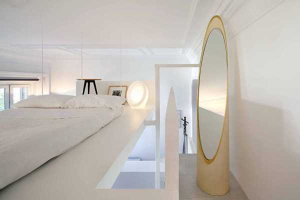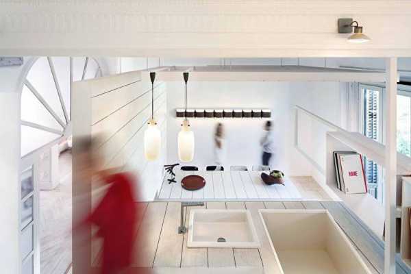 Прихожая располагается немного ниже основного уровня и выходит к большому окну, отделяясь от кухонной зоны невысокой перегородкой. Самая интересная область комнаты — спальня: она находится на втором уровне, как бы «нависая» над кухней.