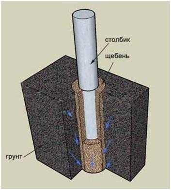 - на дно ям укладывается песчано-гравийная подушка (10 см каждый слой), столбы могут быть засыпаны грунтом или полностью забетонированы;