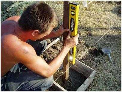 - в первую очередь ставят угловые стойки, работы производят с применением строительного уровня, затем необходимо натянуть шнур между ними, он будет играть роль ориентира для остальных столбов, причем ширина одной секции не должна превышать 2,5 м;
