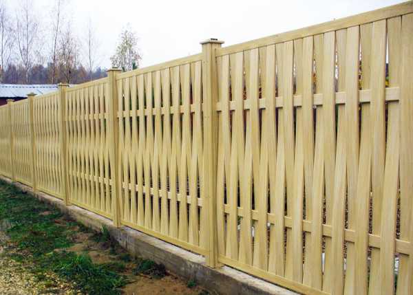 - Деревянный забор в виде решетки. Данный вариант выделяется из ряда исполнений эстетической привлекательностью. Основой в конструкции является рама. К ней крепится обрешетка, сделанная из небольших планок. Они располагаются перпендикулярно друг относительно друга. Встречается два варианта крепления обрешетки: прямой или под углом 45 градусов.