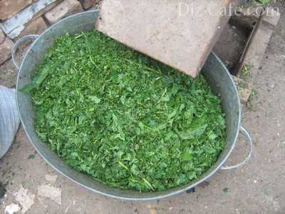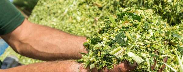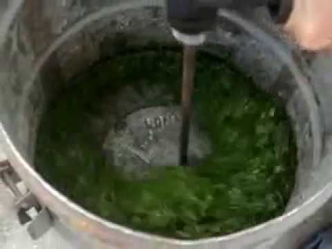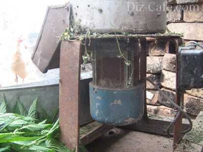 Для удобства работы измельчение сырья лучше выполнять вдвоем. Первый работник осуществляет периодическую загрузку растений, а второй регулирует количество оборотов режущей головки триммера.