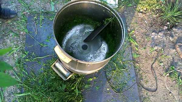 В качестве второго варианта нож насаживается на сверло, а в ведро загружается трава. Дрель опускается в емкость, включается и размалывает сырье. Готовый продукт имеет универсальное применение. Мощность электродвигателя составляет в 850 кВт. Изготавливается такой прибор в течение 15 минут.