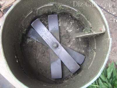 В днище ведра сверлится отверстие и вставляется ось, на которое насаживается нож. Уделяется внимание режущему инструменту. Его заточка ведется односторонняя, чтобы и при небольших оборотах трава превращалась в кашу. Дрель располагается снизу.