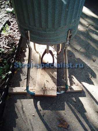 Так же на основание жестко фиксируем и штангу косилки. Для этого можно использовать ее ручку, надежно закрепив в необходимом месте и притянув к доске стальными хомутами.