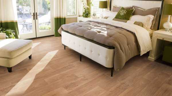 Решая вопрос, как выбрать качественный ламинат для квартиры, если речь идет о спальне, в первую очередь следует ориентироваться на имеющийся интерьер. Оптимально, если комната хорошо освещена и интерьер в ней выдержан в теплых тонах. В таком случае одинаково хорошо будет смотреться как светлый, так и темный ламинат. К слову, на темном покрытии будут хорошо различимы все оттенки цвета.