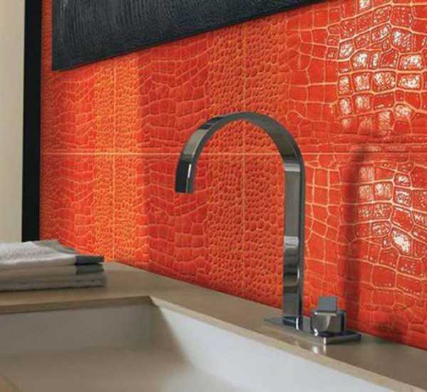 Больше всего этот вариант заинтересует любителей африканского направления в дизайне. В то же самое время такая плитка может использоваться при украшении интерьеров в стиле хай-тек и минимализм. Для изготовления «кожаной» керамики используется пресс и цифровая печать. Готовые изделия принимают вид кожи рептилий и экзотических животных – крокодила, питона, змеи, ската или слона. Такая плитка, благодаря своей необычности, обязательно вызовет чувство восторга у тех, кто до этого никогда не сталкивался с эко-дизайном на кухне.