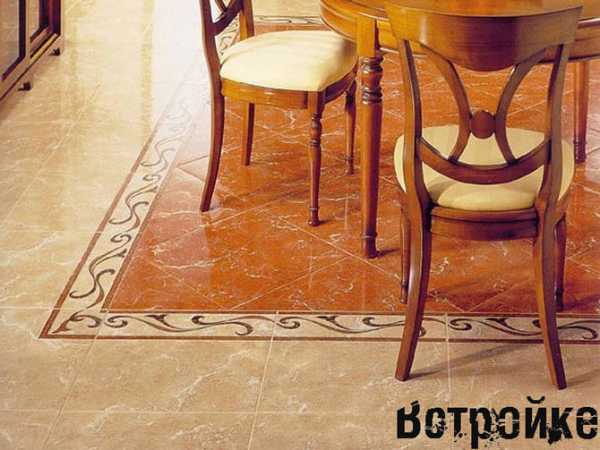 - Для кухни в классическом стиле подойдет пол под мрамор или с орнаментом.