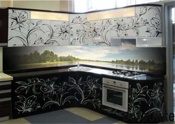 - «Цветочный» дизайн. Растительные орнаменты с листьями и цветами хорошо смотрятся на фартуке кухни. Сочетать их можно как с однотонной плиткой разных цветов, так и с кафелем, имитирующим дерево или ткань.
