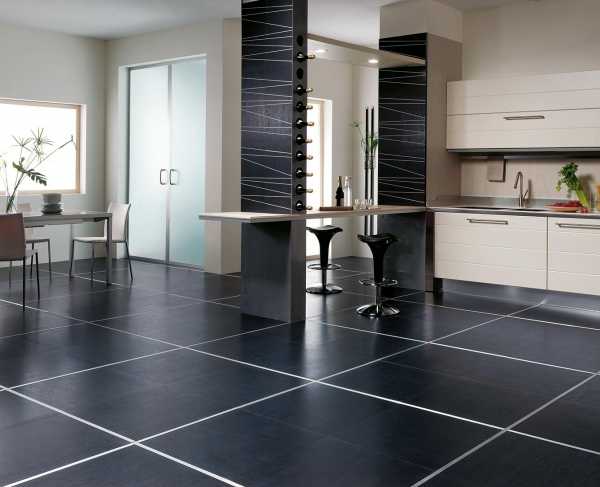 - Светлый пол делает помещение просторней и подойдет для маленьких кухонь. Темные тона подойдут для большой площади, но тогда мебель или стены следует выбрать в светлых тонах.