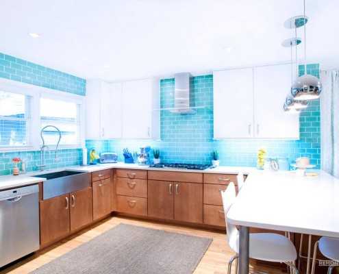 - Яркая плитка для кухни будет уместна на рабочем фартуке.