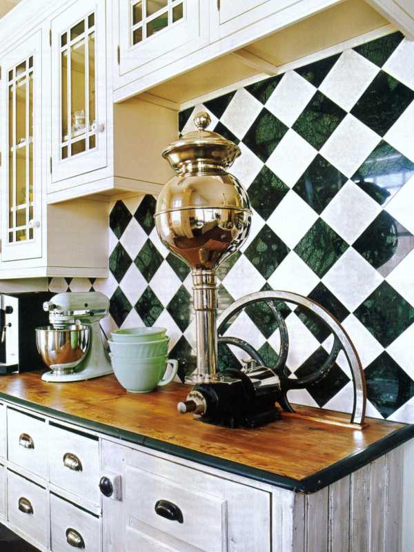 Уникальность этой кухни заключается в плитке, выложенной елочкой. Этот паркетный рисунок, плавно переходящий на стену, был выложен дизайнером Джоди Гулд в ее собственной кухни.