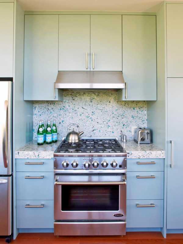 Другим отличным материалом для отделки фартука может стать бетон с использованием битого стекла.