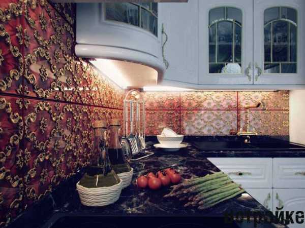 Этот вариант идеально подойдет любителям роскошных интерьеров. Те, кто решил украсить кухню керамической плиткой, имитирующей драгоценные материалы (золото, платину), смогут получить желаемый эффект, не затрачиваясь на эксклюзивную керамику с золочением.