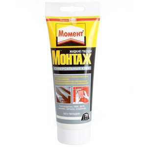 - Другой клей «Момент» — жидкие гвозди («Монтаж»). Соответствует своему названию. Прочно соединит даже плохо сочетающиеся материалы. Есть образцы как для внутренних, так и наружных работ.