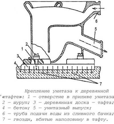 Крепление унитаза на тафту предполагает использование специальной деревянной вставки. На схеме представлены все элементы такого крепления