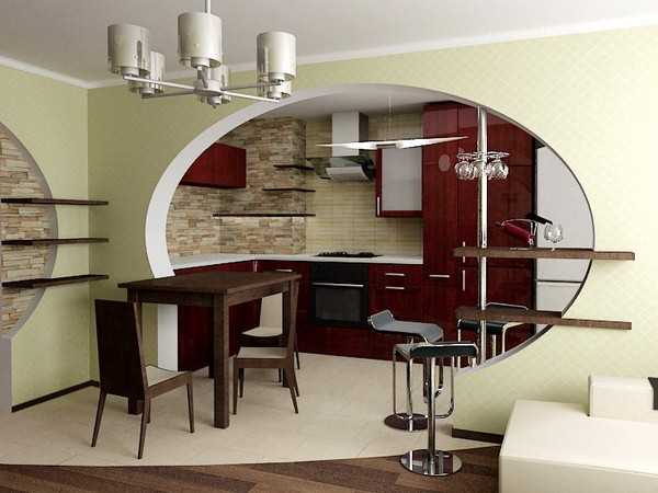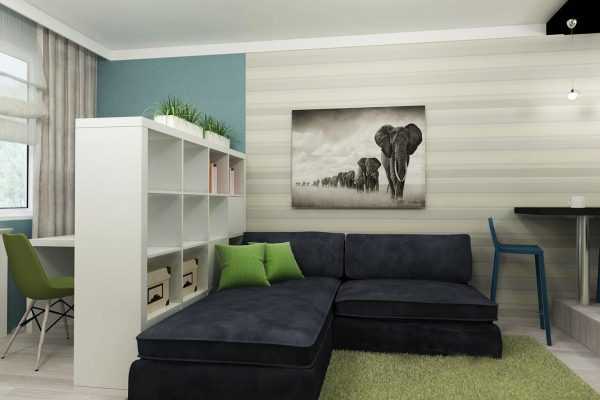 - При зонировании желательно использовать не только разные оттенки стен или пола, но и подходящую мебель (например, небольшой стеллаж, шкаф или барную стойку).