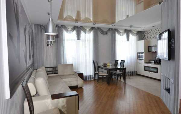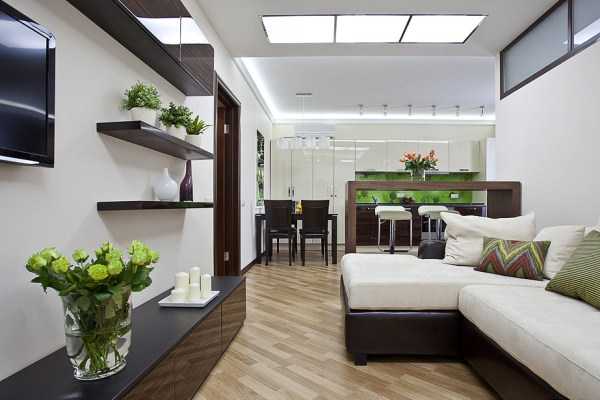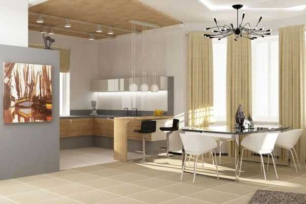 Для сохранения целостности пространства нежелательно зонировать с помощью потолка, меняя его высоту или декор лепнины. И не стоит разграничивать части квартиры разным напольным покрытием – оно должно быть одинаковым везде за исключением санузла и прихожей. Также однотипно оформленными должны быть и окна.