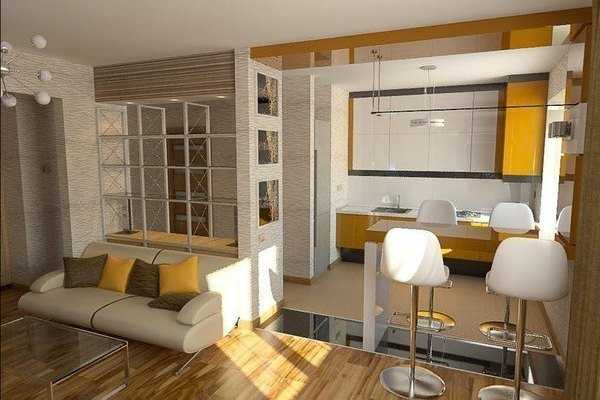 Для кухни можно выбрать стандартную и простую мебель. Для обустройства гостиной можно воспользоваться всеми самыми современными особенностями декора и оформления. Для этого используйте складные, трансформирующиеся конструкции. Это может быть складной стол, кровать, которая в дневное время становится шкафом и другие мебельные гарнитуры.