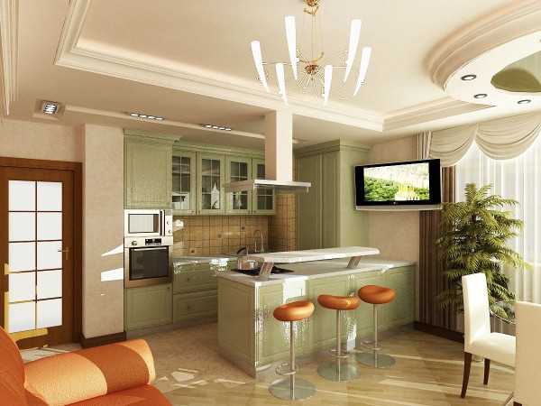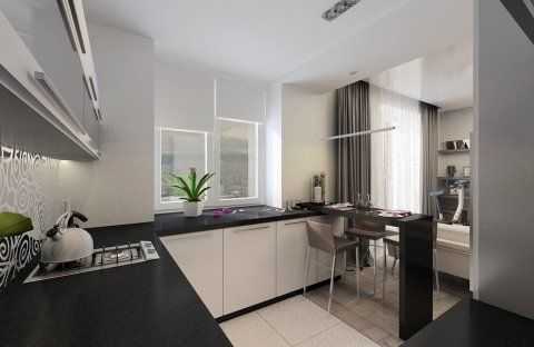 Зона кухни гораздо меньше гостиной, поэтому она должна быть максимально компактной, но при этом и удобной. Стоит отдать предпочтение встроенной технике, тогда не будет ощущения перегруженности. Большую плиту на 4 конфорки лучше заменить на 2 и приобрести маленький духовой шкаф. Для того, чтобы появилась дополнительная рабочая поверхность, требуется микроволновку повесить на кронштейны.