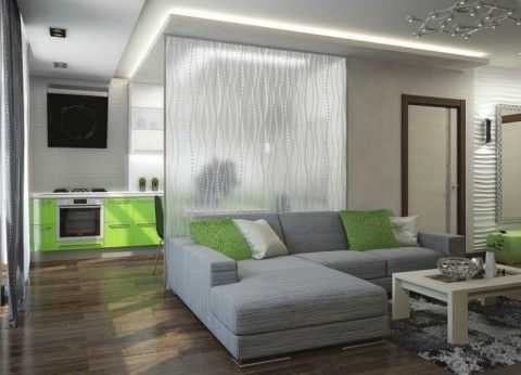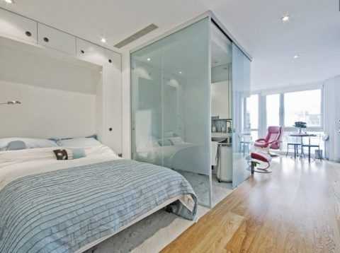 - Чтобы визуально увеличить пространство студии, лучше устанавливать не капитальные, а тканевые или стеклянные перегородки.