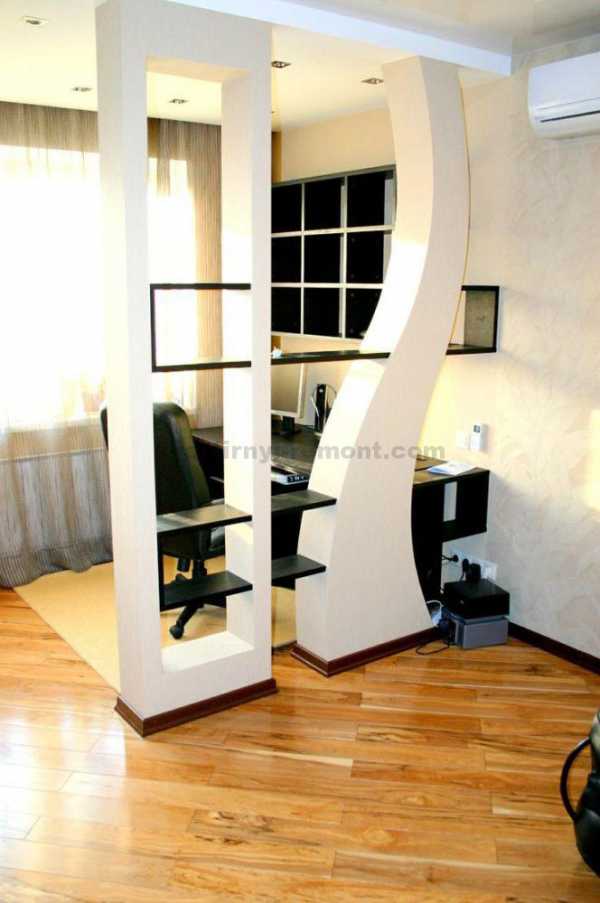 - Разделение этажерками. Позволяет сделать перегородки не только реальными и облегченными, но и функциональными. На них можно разместить различные книги и аксессуары;