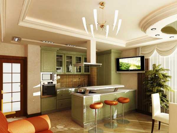- Кухня может располагаться недалеко от входной двери. Преимущественно это характерно для квартир расположенных в домах со старой планировкой. Для того чтобы кухня смотрелась наиболее выигрышно и заметно, разместите её на небольшом подиуме;
