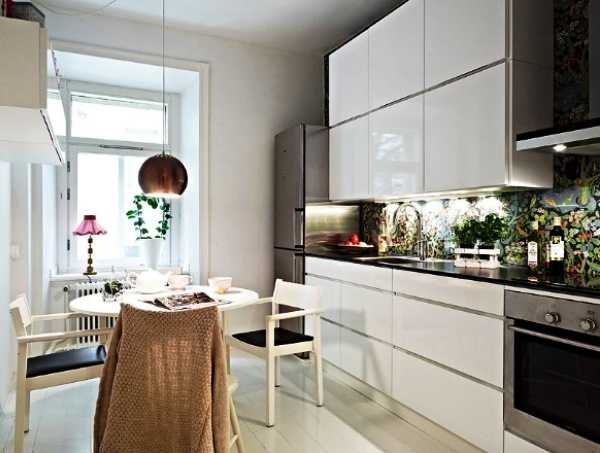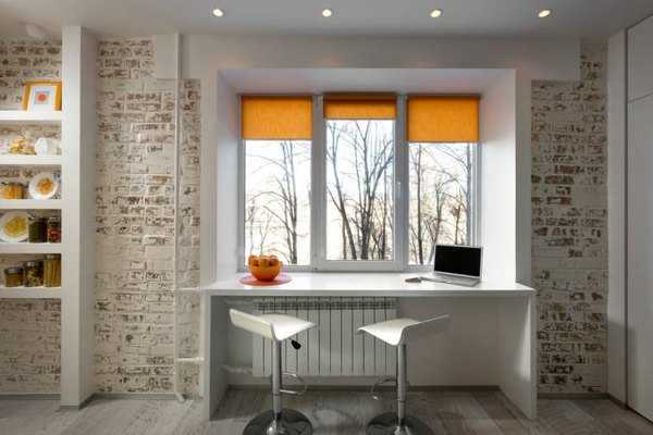 Обеденный стол должен быть максимально компактным, по возможности складным. Подоконник может быть изготовлен из того же материала, что и столешница мебели – благодаря этому появится дополнительная рабочая зона для ваших кухонных дел.