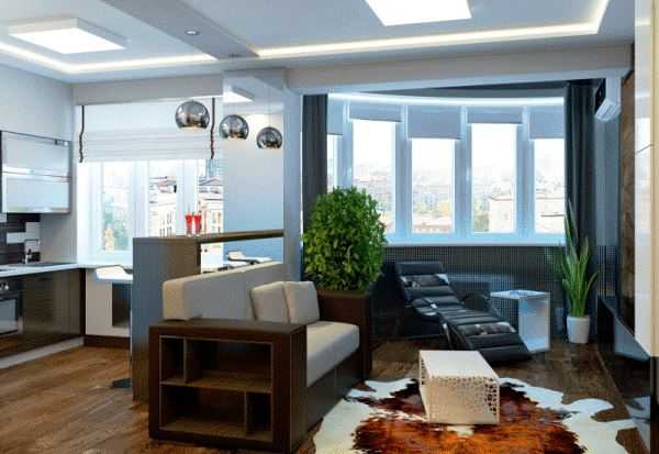 - Если в помещении есть лоджия или балкон, можно сделать её частью основного интерьера. Для этого необходимо убрать перегородку и дверь, оставив небольшое условное разграничение;