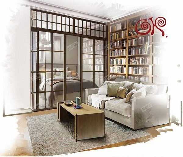 - Замаскировать спальную зону. Кровать не должна бросаться в глаза, поэтому ее прячут – ставят в нишу, закрывают шторами, отделяют стеклянной перегородкой. Другой способ скрыть спальное место – превратить его в предмет обстановки гостиной. Для этого кровать разворачивают длинной стороной к стене и застилают покрывалом, раскладывают декоративные подушки, превращая ее в тахту.