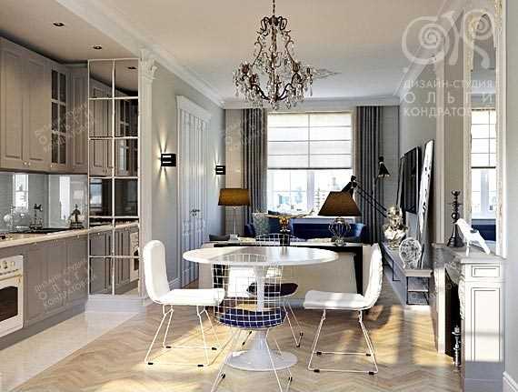 В просторной квартире обустраивают студию, если хотят показать какие-то преимущества жилища, например, большое количество окон, наполняющих светом и воздухом. Здесь частные покои полностью интегрированы с парадными, а служебные, хоть и отделены, но в любой момент могут быть открыты. Для этого ванную, кухню, гардеробную оборудуют высокими широкими дверями или стеклянными перегородками, внутренними окнами и фрамугами.