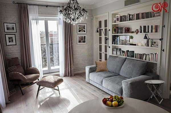 - Разместить узкую мебель. Скромный метраж – еще не повод отказываться от полной меблировки как гостиной, так и спальной зоны. Просто надо подбирать малогабаритные модели комодов, шкафов, стеллажей – глубиной 30–40 см, а также диваны и кресла без массивных спинок и подлокотников.