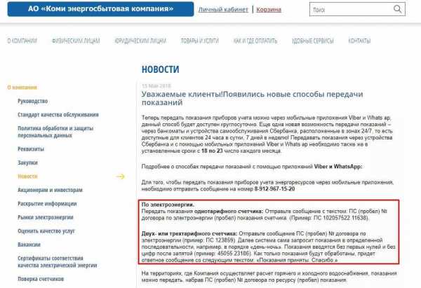 Вариант пятый – мессенджеры. Энергосбыт некоторых городов принимает показания через Vinber (вайбер) или WhatsApp (вацап) — это два популярных мобильных мессенджера для бесплатного общения в сети. На скриншоте ниже вы видите объявление о такой услуге с сайта энергосбыта в р. Коми, г. Сыктывкар.