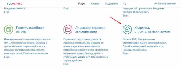 Вариант четвертый – «Госуслуги». Портал «Госуслуги» предоставляет множество функций, среди них есть и услуги, связанные с коммунальными платежами. Для этого нужно зарегистрироваться и в каталоге услуг найти пункт «Квартира, строительство и земля».