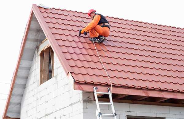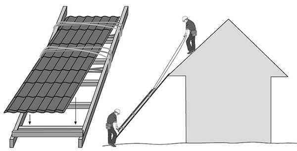 - Крыша расположена высоко, поэтому без стремянки не обойтись. Кроме того, нужно подготовить и специальную лестницу, которая будет закрепляться за коньковый брус. Это приспособление нужно для безопасного передвижения по крыше;