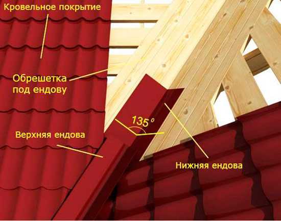 Верхнюю ендову используют, чтоб отвести воду от стыков двух скатов, с внутренней стороны. Прикрепляют саморезами.