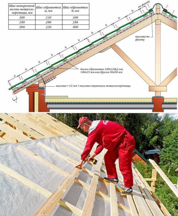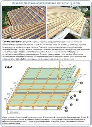 Первая доска обрешетки набивается по краю среза крыши на кобылки стропильных ног. Центр второй доски должен размещаться примерно через 280 − 300 мм от наружного края первой доски. Следующие элементы обрешетки должны закрепляться таким образом, чтобы их центры находились на расстоянии 350 мм друг от друга.