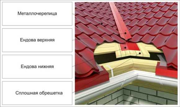 От влаги пространство под кровлей защищает нижняя ендова. Ее установку производят на отрицательных углах в местах стыка ската. Делается это перед настилом металлочерепицы на сплошную обрешетку.