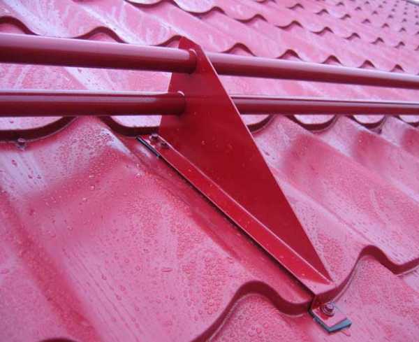 Для того, чтобы обеспечить безопасность перемещения по крыше во время работ по ее обслуживанию, на карнизе крепят вертикальное ограждение. Обрешетку под ограждение делают, как и для других аксессуаров — сплошной. Опоры ограждения закрепляют оцинкованными шурупами в местах прогибов волн черепицы. Опору устанавливают с учетом уровня наклона крыши. Шаг между двумя соседними опорами зачастую составляет 90 см. После того, как опоры зафиксированы, к ним крепится ограждение.