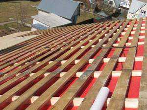 - Сверху слоя гидроизоляции к стропилам крепятся бруски контробрешетки. А непосредственно к ним сама обрешетка.