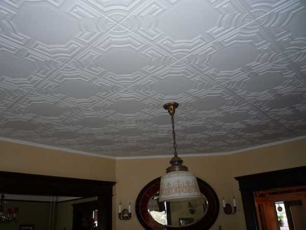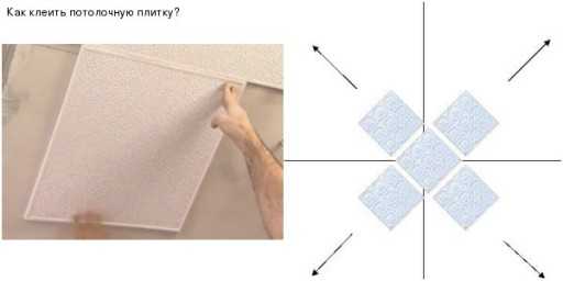 Чтобы потолок смотрелся эстетично, правильнее клеить потолочную плитку по диагонали от центра.