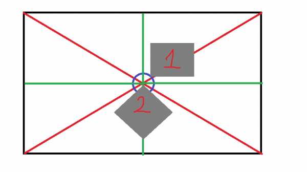 - Схема в этом случае такая: очерчиваем на потолке прямоугольник и разделяем его диагональными линиями. Единственно, необходимо проконтролировать, чтобы центр прямоугольника был определен правильно и соответствовал точке крепления осветительного прибора.