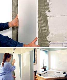 Быстро и дешево они монтируются на клей, поскольку каркас не используется, сохраняются размеры ванной. Материал демонтировать окажется сложнее. Отделка должна быть не слишком тяжелой, тогда установка окажется удачной.