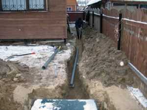 Вне дома также оптимально использовать полимерные трубы. Для их прокладки вырывается траншея на глубину промерзания грунта, на ее дно насыпается песчаная подушка, а затем под уклоном 2-3% укладываются трубы. Если невозможно обеспечить достаточно глубокое залегание, то необходимо тщательно утеплить трубы.