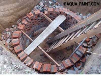 Материалом для возведения стен является красный кирпич, раствором для укладки – смесь песка и глины, которая в дальнейшем сыграет роль штукатурки. Кладка производится традиционным способом – со сдвигом кирпича наполовину в следующем ряду. Минимальная толщина кладки – 0,25 м. Кирпичные стены частично водопроницаемы, но как сделать сливную яму герметичной? А очень просто — необходимо использовать битумную мастику или похожий гидроизолирующий раствор.